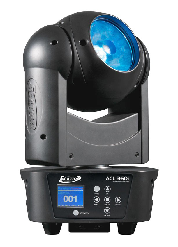 La cabeza móvil con giro continuo de 360° en Pan y Tilt Elation ACL 360i cuanta con un módulo Led RGBW de 60 vatios de potencia y una lente ACL (Advanced Collimator Lens) que proporciona un haz de 4° de apertura.