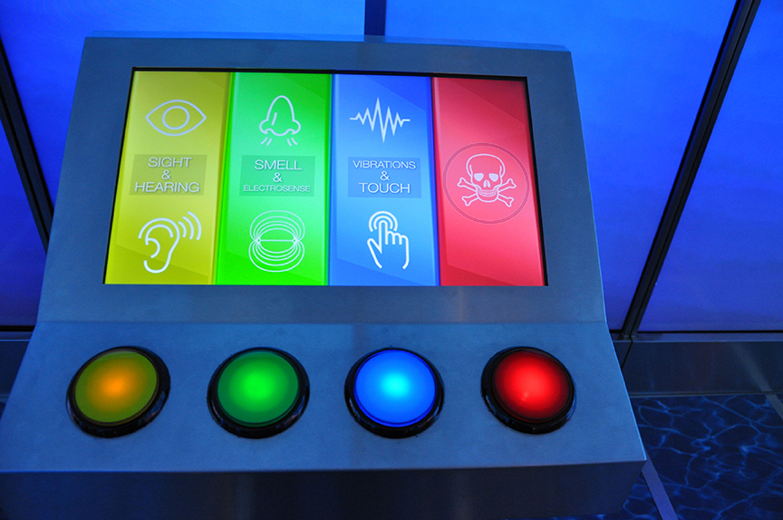 Los visitantes que se encuentran dentro de la jaula pueden utilizar los botones de los kioscos para seleccionar un vídeo adicional que se visualiza en la parte superior, mientras que se ofrece la presentación principal en forma de bucle. Estos vídeos explican diferentes aspectos de la vida de los tiburones como, 例如, cómo funcionan sus sentidos. Los botones de control acceden directamente a los reproductores a través de las entradas UDP.