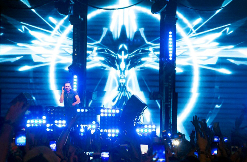 La actuación de Tiësto contó con 12 unidades de la matriz Led con giro continuo 360° en Pan y Tilt ACL 360 Matrix y 12 barras Led Cuepix Batten de Elation, 谁的品牌经销 视觉效果视觉效果, que se instalaron en 4 tótem de truss detrás del escenario con 3 unidades de cada aparato en cada tótem proporcionando variados efectos visuales.