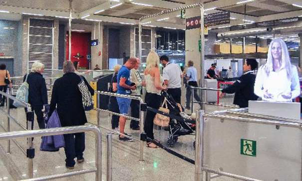 这是 Aena 进行的第二次实施, 在马略卡机场的那次之后. 这个女人的全息图位于过滤器的入口处,并发出不同的消息和指令以通过安全控制, 例如手提行李中液体运输的规定以及旅客的行为.
