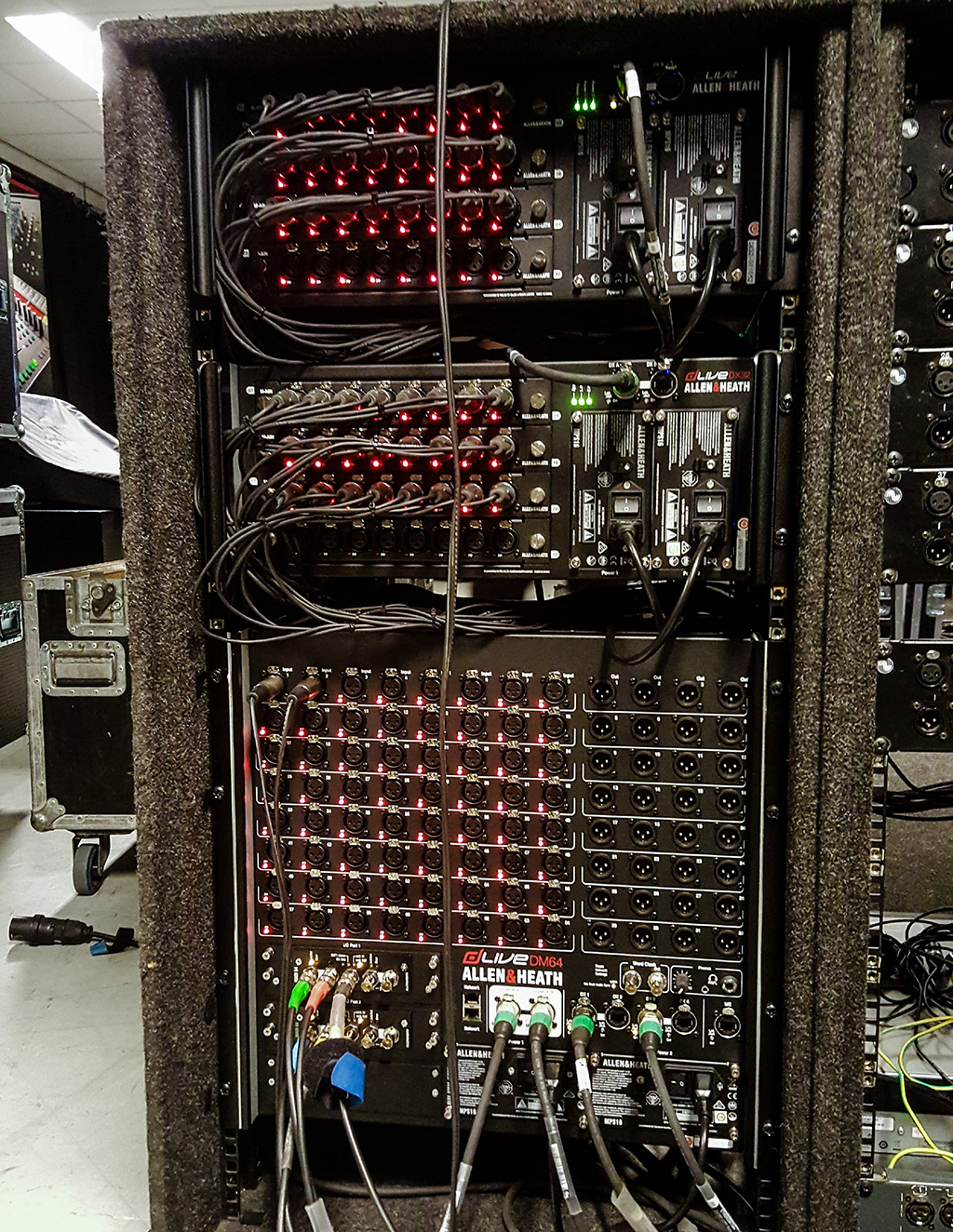 El sistema de Allen & Heath que se utiliza en estos conciertos consta de una superficie de control S7000, un rack de mezclas DM32 para el FOH, con Waves y MADI, un sistema virtual de comprobación de sonido y equipamiento para el procesamiento a tiempo real SoundGrid. 除了, cuenta con una mesa de control S5000 con un MixRack DM64 y dos racks de expansión adicionales DX32.