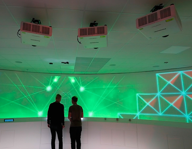 常设展览用途 15 投影仪和 3 的屏幕 55 距离松下几英寸, 入口处安装了四台PT-RW630 DLP激光投影仪. 它还设有一个互动区,展示音乐流派的舞蹈文化。, 并使用运动控制,以便参观者可以尝试将自己的轮廓投射到面前的屏幕上.