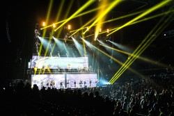 Las cabezas móviles Platinum SBX se desplegaron sobre el decorado del escenario para iluminar a la banda a contraluz y para marcar una percepción de distancia entre y la pantalla Led de video situada en la parte trasera del escenario.