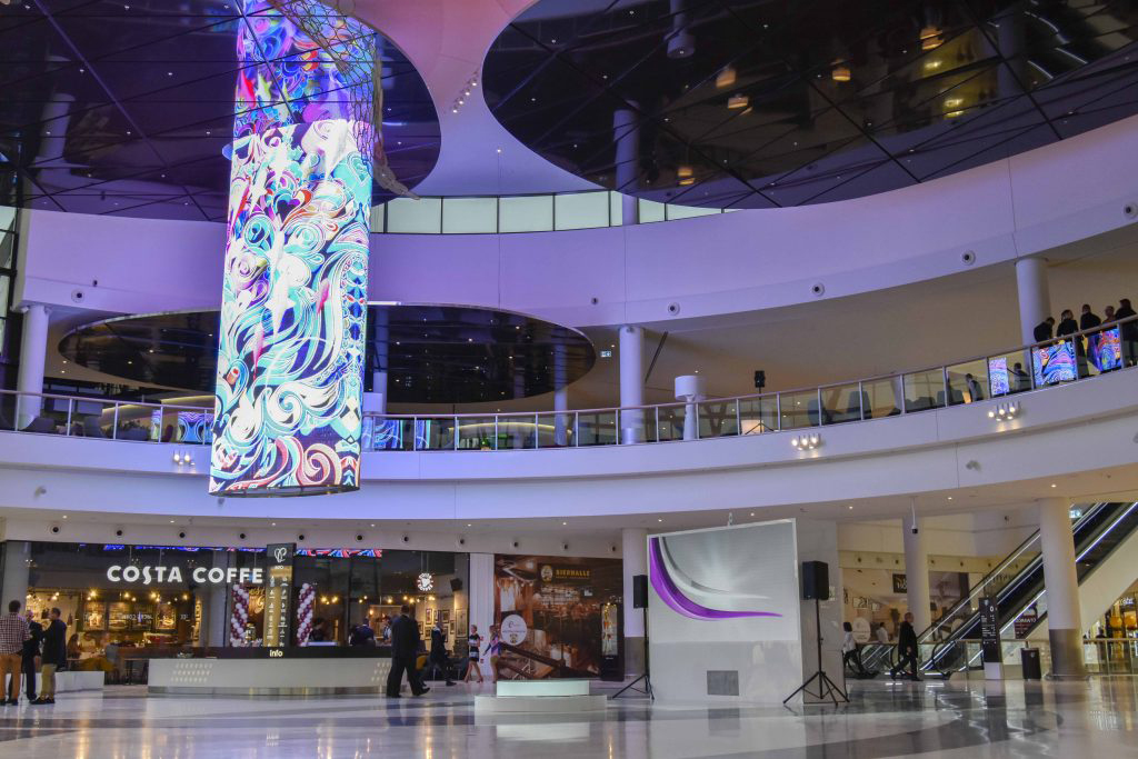 La instalación de digital signage más llamativa y espectacular es una pantalla Led elíptica transparente que se encuentra suspendida del techo. “Es la mayor estructura de este tipo en esta parte de Europa, con casi cien metros cuadrados, y la única que tiene una forma elíptica, con una transparencia del 90%”, explica Grzegorz Góralczyk, CEO de SQM Digital Signage. Una estructura que ofrece una elipse de 360 grados y en la que se han utilizado desde pequeños dispositivos de 10 pulgadas hasta pantallas Led de más de 50 地铁.