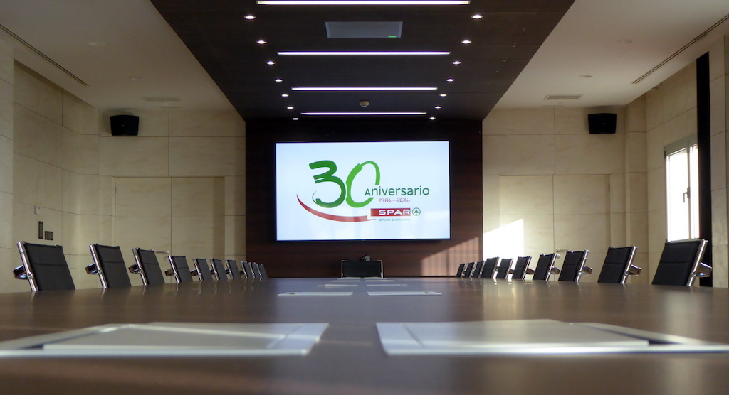 El nuevo centro de distribución de Spar Gran Canaria dispone ahora de una moderna y funcional sala de juntas equipada tecnológicamente para acoger todo tipo de eventos, que forma parte de la nueva nave con la que esta cadena de supermercados ha ampliado, 在 14.000 平方米, sus instalaciones y que se añaden a las ya existentes en El Goro (的 21.000 平方米), en la localidad grancanaria de Telde.