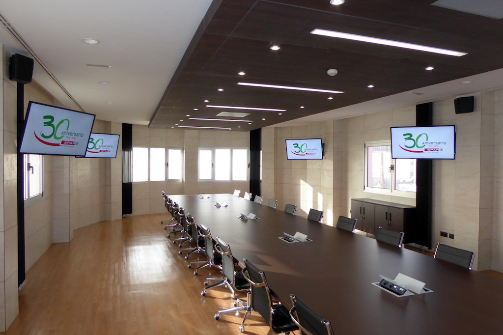 La sala de juntas cuenta con un completo sistema audiovisual, integrado por el especialista DJ3 网络, con una arquitectura funcional del sistema que permite, de forma muy sencilla, la realización de todo tipo de presentaciones, 会议, seminarios y reuniones de trabajo, incluyendo capacidades para videoconferencias y llamadas telefónicas en grupo.
