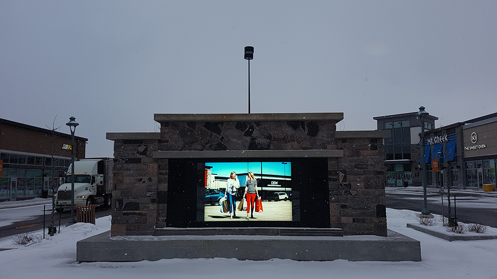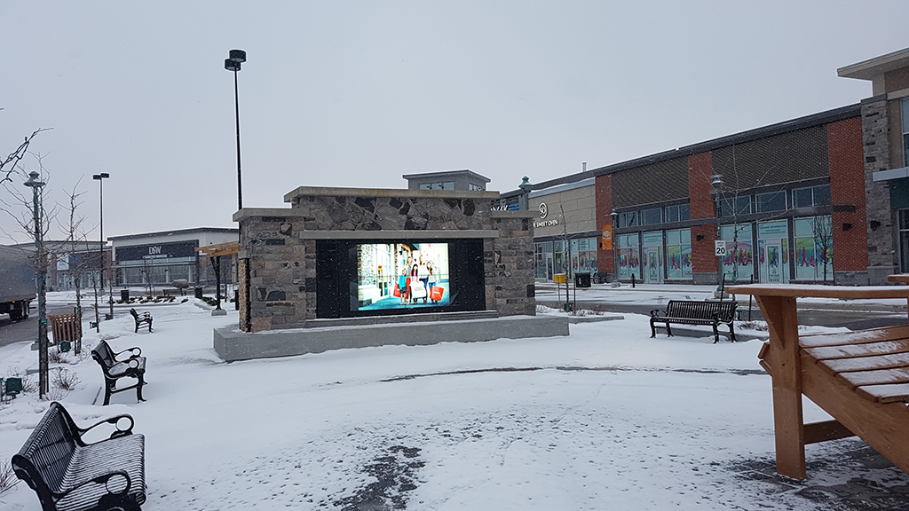 El Park Place de Barrie (加拿大) es un centro comercial al aire libre que ofrece a sus visitantes una zona con una gran chimenea y a la que se ha dotado de un elemento que la hace aún más atractiva. Se trata de una gran pantalla de señalización digital que muestra sus imágenes con gran nitidez bajo el sol del verano y soporta los rigores del invierno.