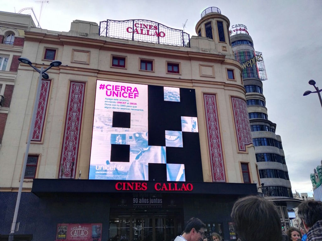 作为活动的一部分 #close联合国儿童基金会, 该组织在智威汤逊的帮助下推出, 从今天开始, 24 三月直到明天, 天 25, 前往马德里卡亚俄广场的人们可能会导致该地区出现小规模“停电”, 主要在数字屏幕上, 感谢与的合作 卡亚俄城市之光.