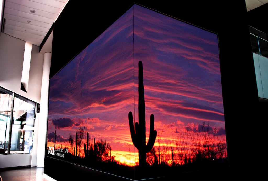 No es frecuente que el muro interior de un edificio se utilice para impresionar visualmente a los transeúntes desde el exterior, tal y como sucede con el recientemente renovado vestíbulo de la Facultad de Derecho de Phoenix (Beus Center for Law), perteneciente a la universidad pública del Estado de Arizona, con la instalación de una pantalla Led de alta resolución en su interior, visible con total nitidez desde el exterior a través de los grandes ventanales de este espacio.