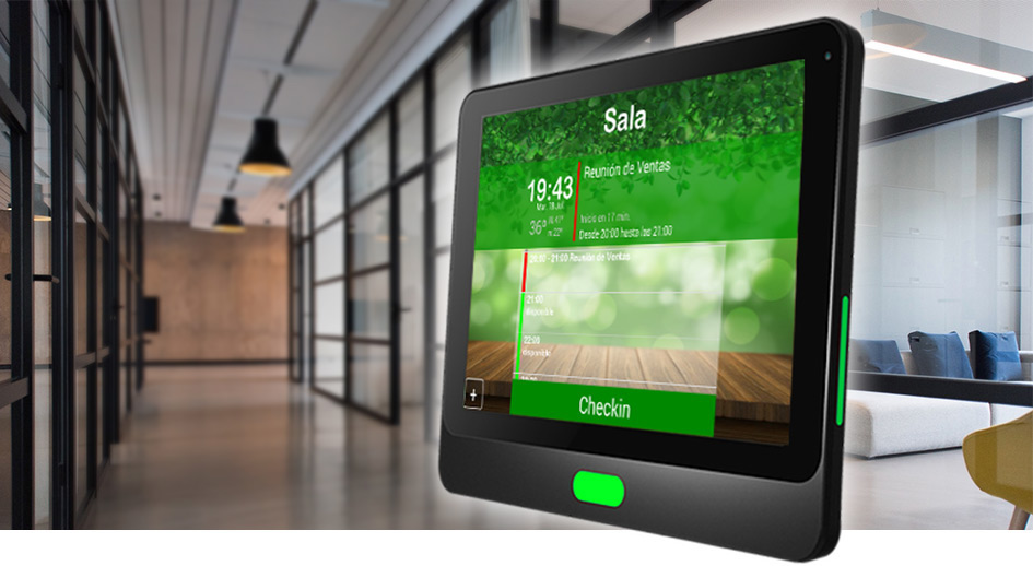 除了, cuenta con señalización mediante luces para avisar del estado de ocupación del espacio. El color de fondo de la interfaz de usuario y las luces Led laterales del panel se alternan con los colores verde y rojo dependiendo del estado de disponibilidad de las salas, así como conocer la hora a la que estará libre.