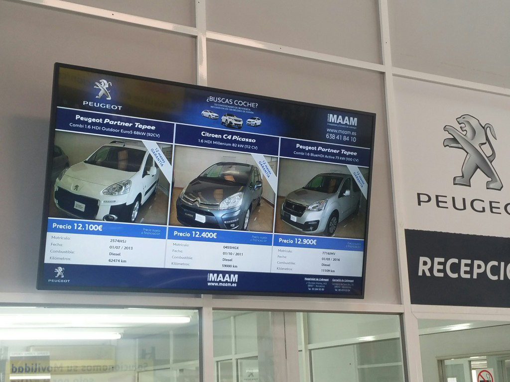 Con objeto de ofrecer experiencias innovadoras, se han instalado dos monitores de cartelería digital tanto en el taller como en el concesionario. Estas soluciones permiten publicitar los vehículos en venta (nuevos o de ocasión) así como los servicios extras que se ofrecen, desde los seguros a los mantenimientos posventa o las revisiones.