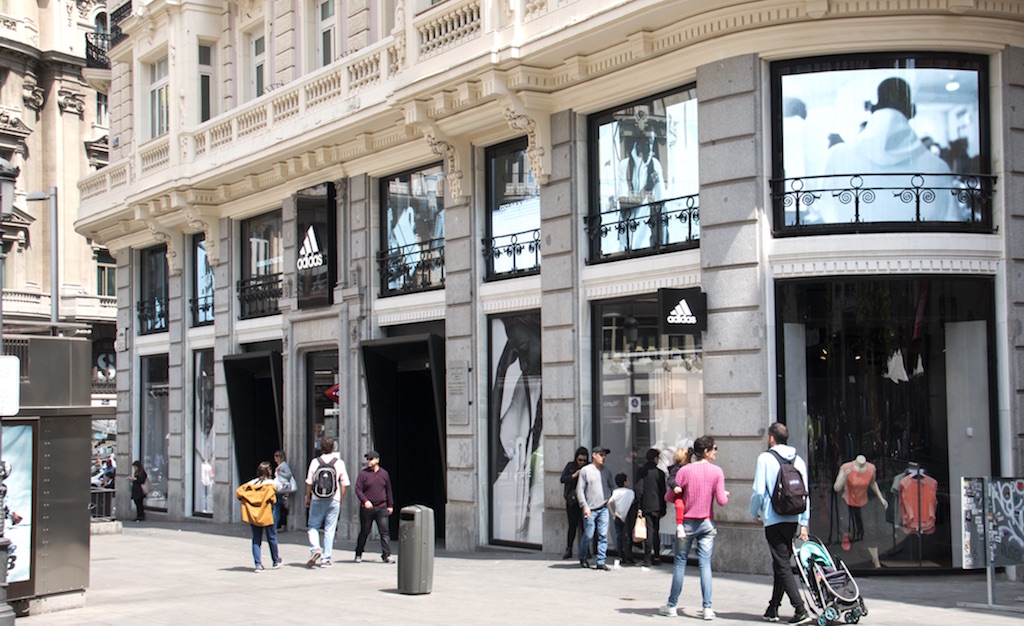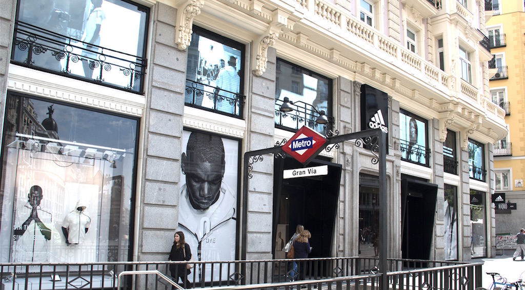 La marca de deporte alemana ha reformado recientemente su principal establecimiento en España con sistemas de visualización Led de alto brillo en los ventanales del edificio histórico que ocupa en el centro de la capital, en un proyecto ejecutado por Led Dream a través de su partner TMT Factory.
