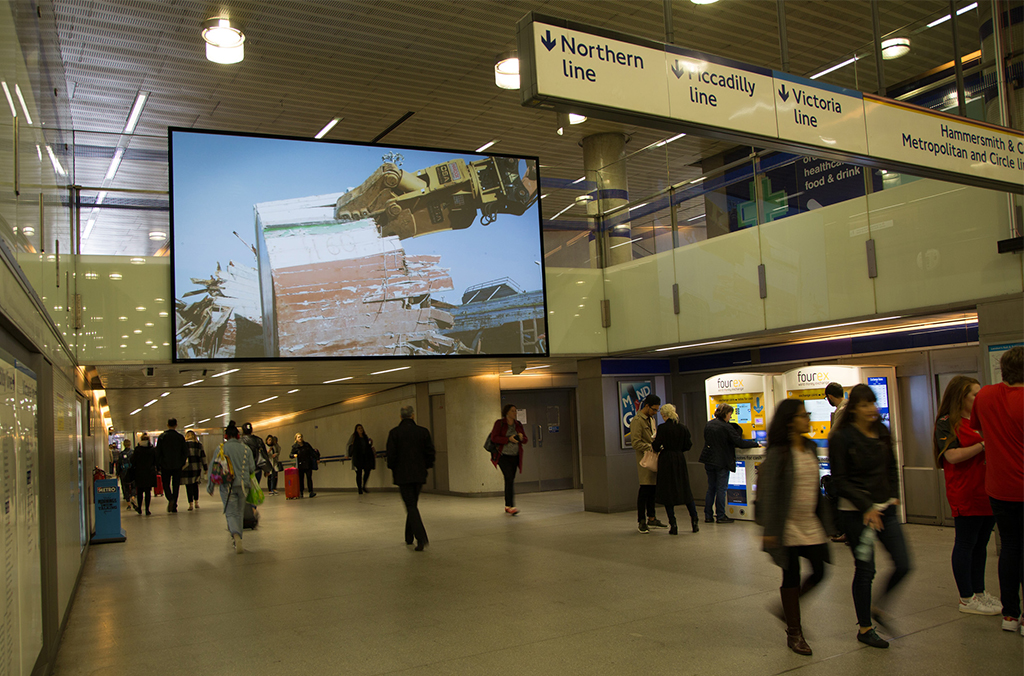 En la estación de metro King’s Cross St Pancras se ha instalado una pantalla Supernova Infinity de 5 米宽, así como un proyector láser de Panasonic de 10.000 流明. Equipos responsables de captar la atención de los transeúntes con la proyección de la película, 的 12 minutos de duración, The Bureaucracy of Angels, de los artistas Broomberg & Chanarin.