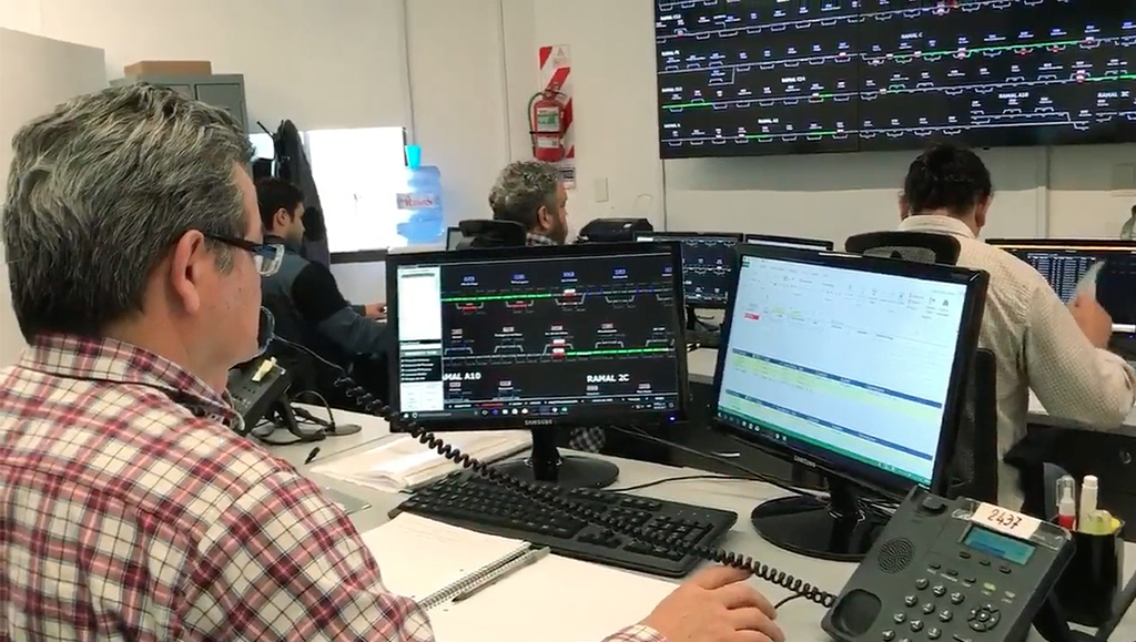 Las pantallas reflejan la información proveniente de un software de gestión de tráfico ferroviario provisto por la firma brasileña ART, a través del cual se puede gestionar, 实时, el posicionamiento de los trenes y su velocidad a lo largo de 9.000 kilómetros de vías, así como autorizar su circulación y activar el frenado automático en caso de emergencia.