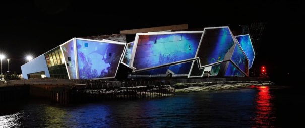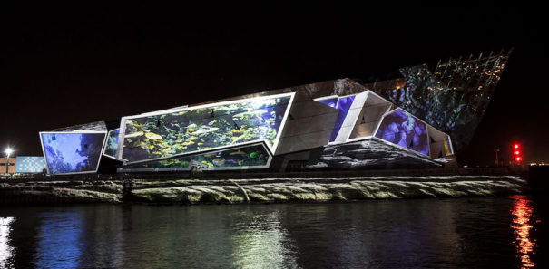 QED Productions ha utilizado diecisiete proyectores láser de alto brillo de Panasonic para crear un espectacular evento de mapping con proyección arquitectónica en este emblemático acuario.