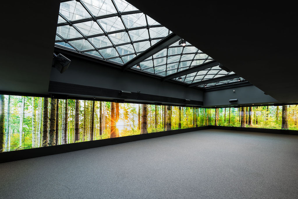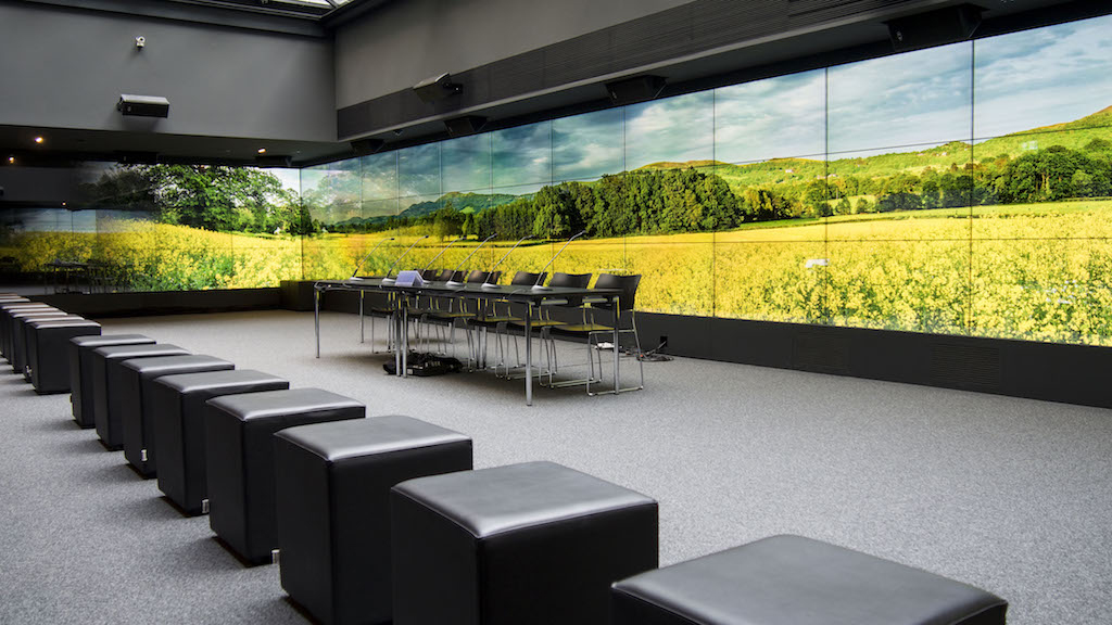 La mayor atracción de este espacio se encuentra en una gran sala donde se ha instalado un gran videowall que ocupa tres paredes. 该设施有 87 pantallas Panasonic TH-55LFV6W dispuestas en 29 columnas con tres alturas.