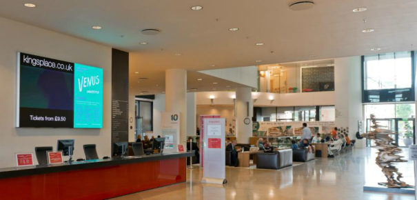 Kings Place es un centro de conferencias y arte financiado de forma independiente en el corazón de Kings Cross (伦敦), que se esfuerza por la diversidad y apuesta la innovación. Esta sede ya había invertido en tecnología de vanguardia, incluidos equipos de audio y vídeo, y, ahora, buscaban una solución de visualización para ubicar en la recepción que permitiera mostrar noticias e información de forma actualizada.