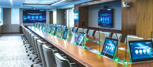 Para este proyecto se han instalado veintidós unidades de participación, cada una con un LCD de 21”, un micrófono y botones de control, oculto cuando no está en uso. Con el toque de un solo botón en el panel de control de Crestron, las unidades DynamicX2 con doble DynamicTalk se elevan, con un movimiento suave y sincronizado, se encienden y se inclinan al ángulo de visión correcto.