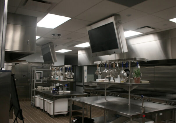 Cada pantalla plana está montado en ángulo, por encima de una estación de trabajo, de forma que es posible visualizarlo sin utilizar el espacio del mostrador o interferir en la preparación de la comida. Con el fin de capturar actividades de clase para presentaciones en directo, se han instalado en el techo cámaras PTZ de 松下 con salida de señal HD-SDI.