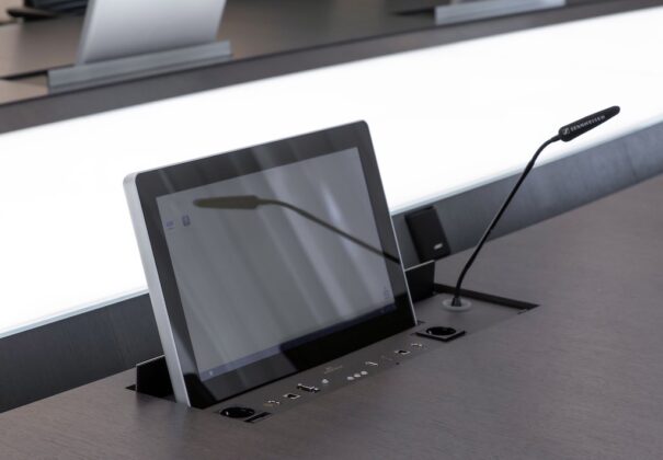El reto era proporcionar una solución completa que incluyera monitor, micrófono y conectores que pudieran retraerse sin problemas en una superficie de madera de alta calidad, dejando la menor huella en el diseño de la sala y mobiliario. Nada debía ser visible cuando este equipamiento tecnológico no tuviera que utilizarse, optimizando así la flexibilidad de uso del espacio y respetando su diseño.