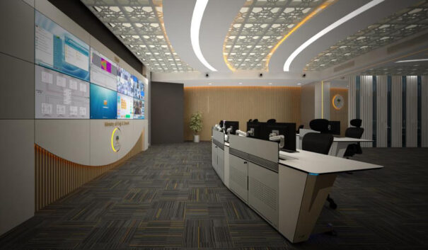 总共安装了六个操作站和相同数量的视听图腾。, 配备三星ME55C显示器 55 英寸, 四个行政站, 主管职位, 配备会议控制台的危机室 12 用户和文件模块.