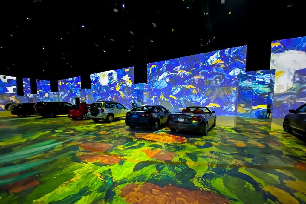 Immersive Van Gogh Exhibit se ha convertido en la primera experiencia de arte inmersivo del mundo tras ser adaptada a la la pandemia mundial. El director artístico de la exposición, Massimiliano Siccardi, ha diseñado un espacio para que hasta cuarenta coches puedan visitar la exposición en cualquier momento, y da la bienvenida a los visitantes que van andando con círculos de distanciamiento social.