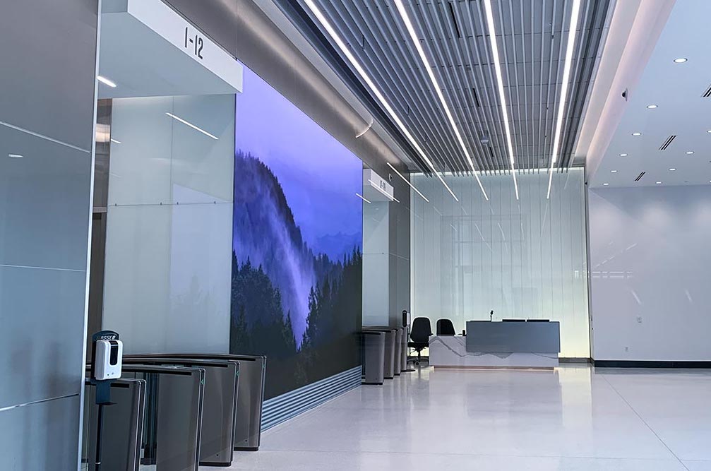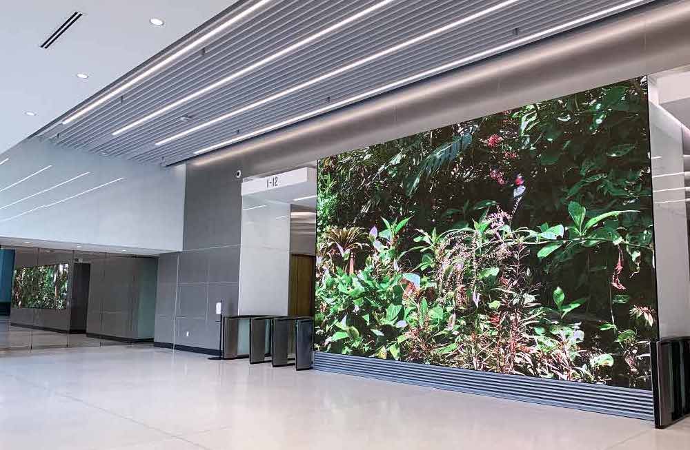 Ubicada fuera de la sala de ascensores del primer piso del rascacielos se ha instalado una pantalla Led de 4 米高和 6 de ancho que puede verse desde el exterior de la entrada del vestíbulo, de fachada de vidrio, a lo largo de la céntrica avenida East Kilbourn.
