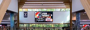 总共有 7,7 百万像素, que se distribuyen en dos grandes pantallas Led de SNA Displays de su gama Bold, presiden el vestíbulo de la sede norteamericana de Associated Bank River Center, con contenidos personalizados por cFire.