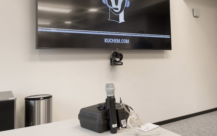 También es posible instalar dos puntos de acceso MXCW móviles adicionales en cualquier sala de conferencias mediante Dante para que los micrófonos del foro puedan utilizarse en todo el campus. Tres cámaras PTX OneLink RoboShot, que se pueden manejar y mezclar de forma centralizada a través de una consola de vídeo, transmiten y graban lo que ocurre en la sala.
