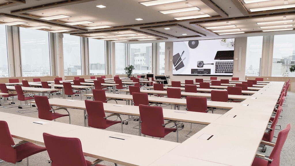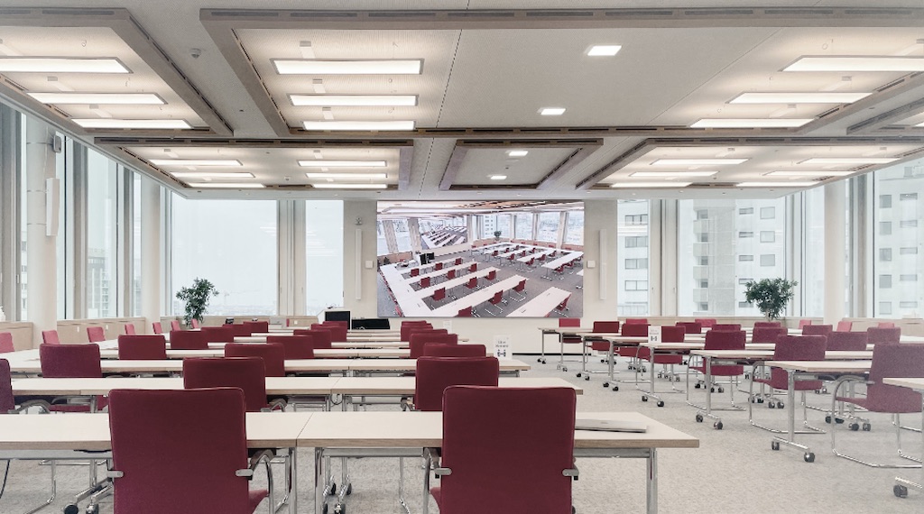 El foro del centro de conferencias, situado en la novena planta de la Torre DIN, ofrece un espacio para doscientos participantes, en el que cada uno puede contribuir en la videoconferencia desde su propio asiento.