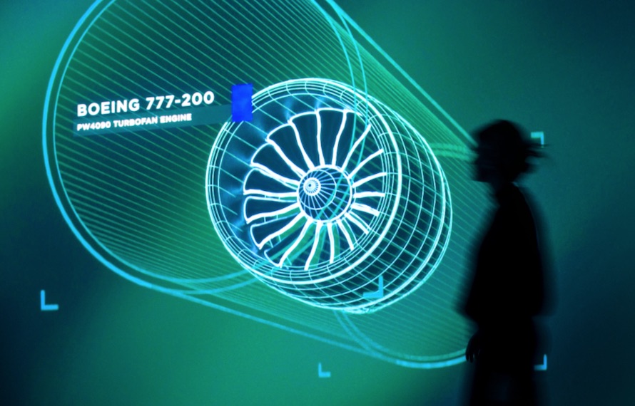 Airshop创新中心 联合航空 有一个沉浸式剧院, 270° 投影映射, 真人大小的 3D 互动内容和培训区, 用于公共演示和内部开发.