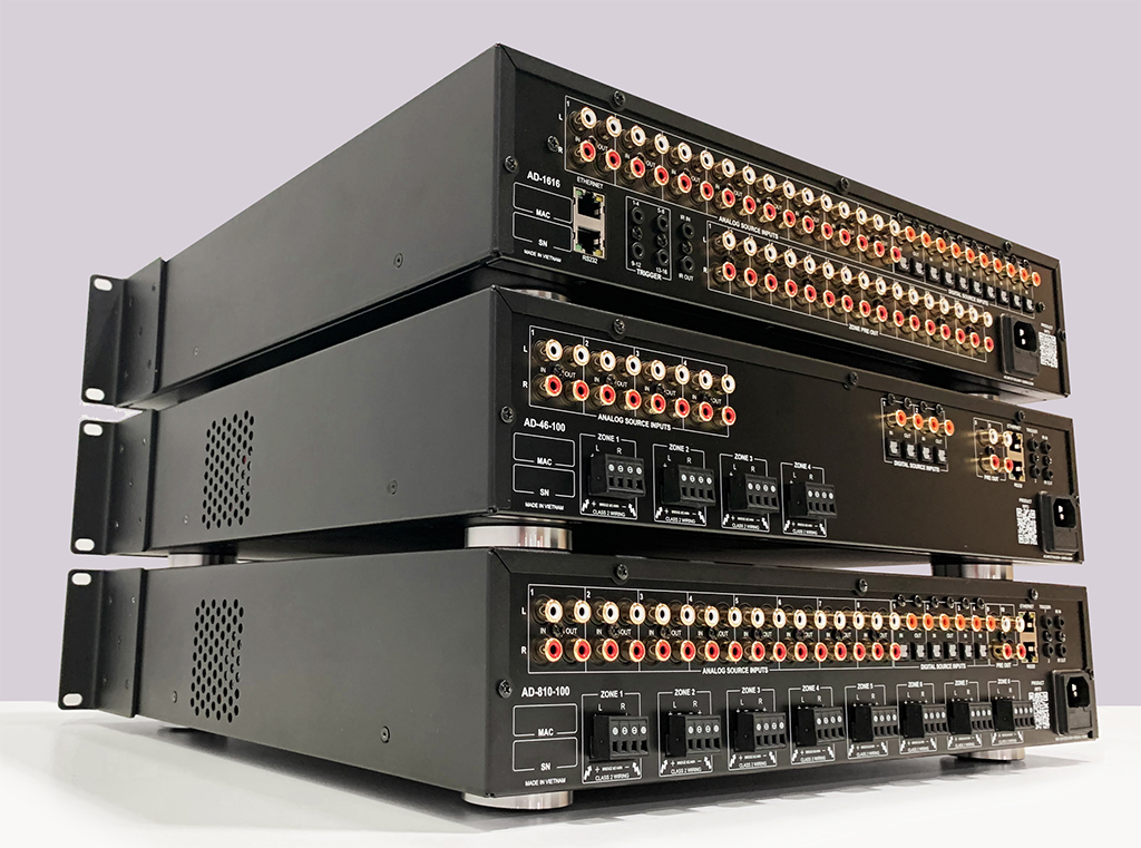 La serie incluye el AD-46-100, una matriz amplificadora DSP 4×6 para distribución de hasta cuatro fuentes de audio a seis zonas, con cuatro zonas amplificadas a 100W, 和 AD-810-100, una matriz amplificadora DSP 8×10 para hasta ocho fuentes y 10 zonas, con ocho zonas amplificadas a 100W.