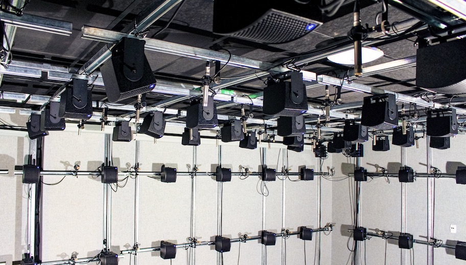 总共有 128 altavoces del modelo coaxial bidireccional CX41 de 伦库斯-海因茨 facilita los proyectos de investigación de audio inmersivo y espacial del nuevo laboratorio de acústica de esta universidad canadiense.