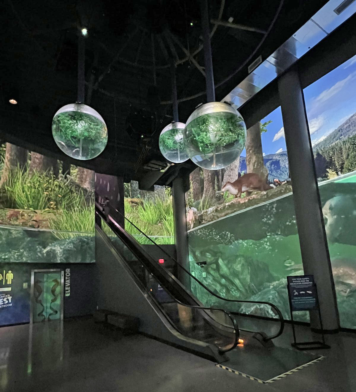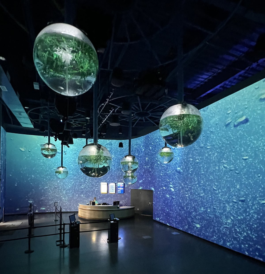 游客将被一个身临其境的水下世界所吸引 12 H 系列 1DLP 投影机, el software Mystique y servidores Pandoras Box de 克里斯蒂. 除了, en la cafetería se ha instado una pantalla Led del mismo fabricante de 13,27 metros cuadrados que ofrece contenidos temáticos sobre el mundo oceánico.