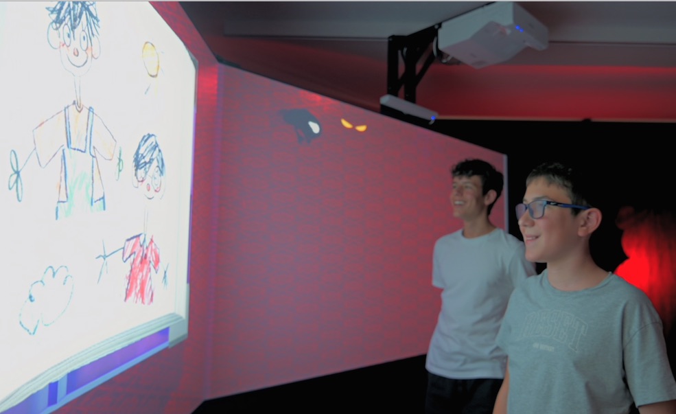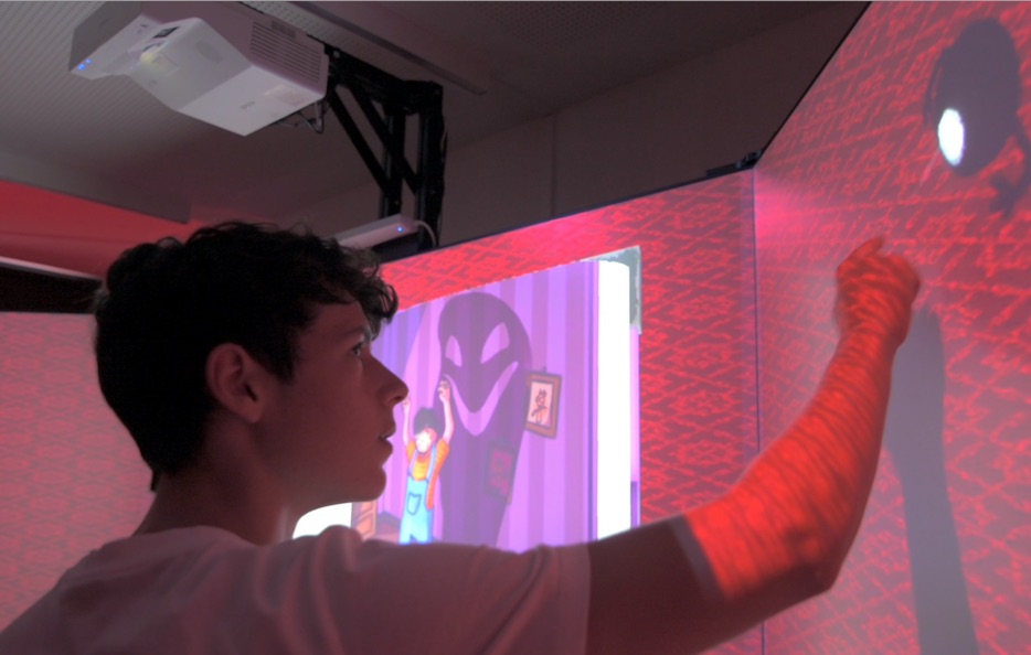 经验 讲故事的人 集成了 互动教学系统 在爱普生, 的结构 6 米宽和 3 高是基于的组合 三台超短焦激光投影仪, 配置一个 混合 具有持续交互性的三个屏幕 从头到尾.