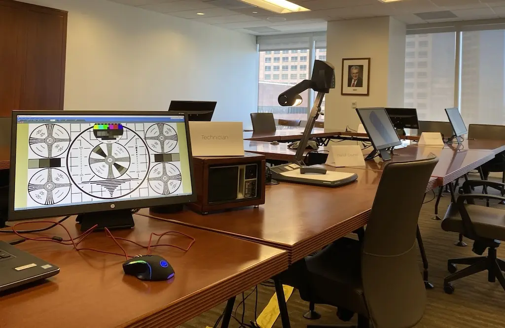 Una vez preparados todos los materiales, los abogados seleccionan un jurado y Stary visita la sala del tribunal para determinar las necesidades audiovisuales. Con el permiso del juez, conecta un divisor HDMI al monitor del estrado de los testigos y lleva la señal del divisor a un U-TAP y a su ordenador portátil. Esto le permite capturar las principales pruebas presentadas y admitidas por el juez con el software Open Broadcaster Software (OBS). Durante el proceso, el alguacil regula quién puede presentar en este monitor y en otros.