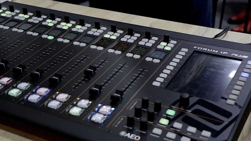 En el ámbito de la mezcla de audio, AEQ exhibió en Barcelona la Forum IP Plus, una consola modular completamente renovada. Este modelo introduce faders motorizados, pantallas a color integradas en cada canal y un display táctil central que mejora significativamente la operatividad. 从技术层面来说, incorpora conectividad Bluetooth y tres circuitos de auriculares amplificados, ampliando sus capacidades en entornos de producción.