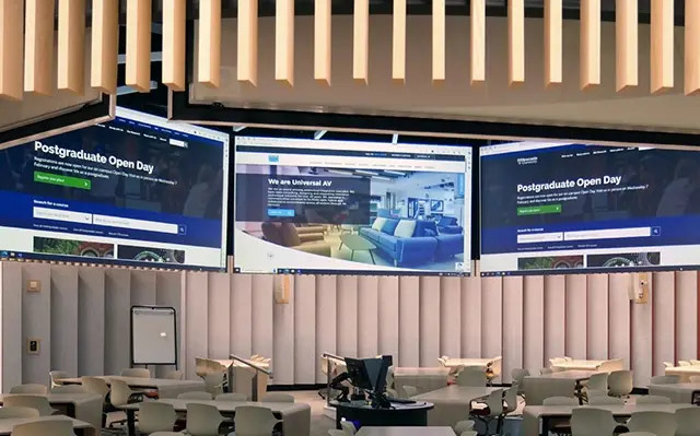 Otras aulas utilizan proyectores láser Sharp/NEC de las series PA y P, combinados con pantallas de marco fijo. Las salas de clústeres de TI están equipadas con proyectores NEC P605UL y PV710UL para adaptarse a diferentes distancias de proyección, mientras que las salas de reuniones y los espacios de enseñanza más pequeños cuentan con pantallas de gran formato NEC con presentación inalámbrica y conferencias integradas.